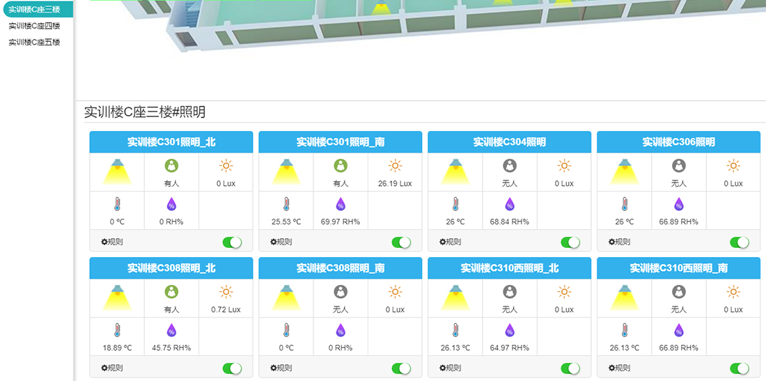主要包含照明总览、照明控制、节能统计、后台管理等主要模块,主要实现了设备智能控制,实现人走关灯,人来自动开灯,实现分区域自动控制照明,全程无需人为干预,按照节能减排方针,实现能耗最优。技术特点:本软件设计基于RESTful API标准,可以实现跨平台通信,采用了领域模型设计原则,可以更好的实现软件的高内聚,低耦合要求,所有与硬件的设备的通信分为MQTT协议和RESTful API,数据通信效率高,所有的硬件设备通过平台自动配置运行规则和数据采集,完全实现了硬件数据实时采集,实时UI展现,数据全动态化可视操作。
